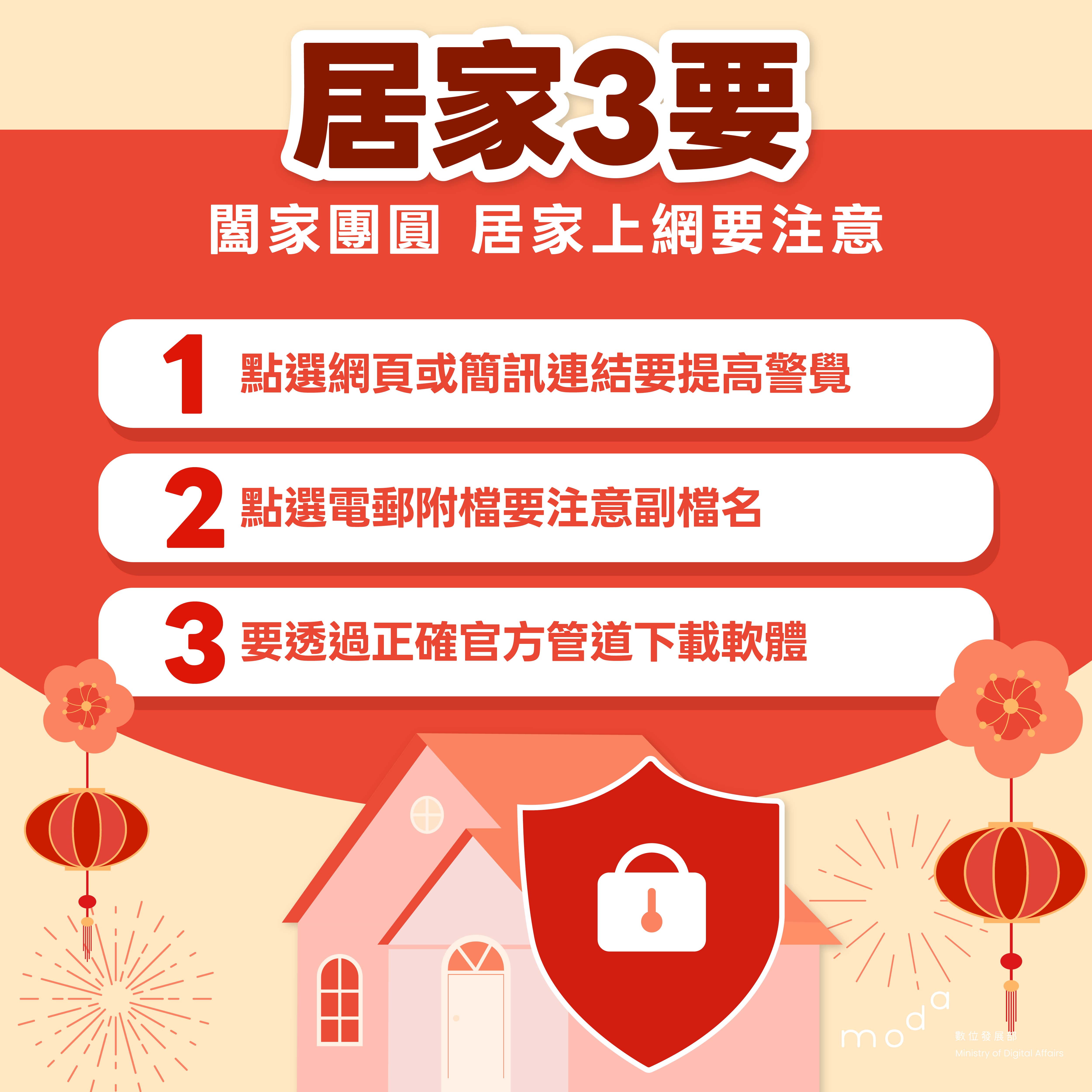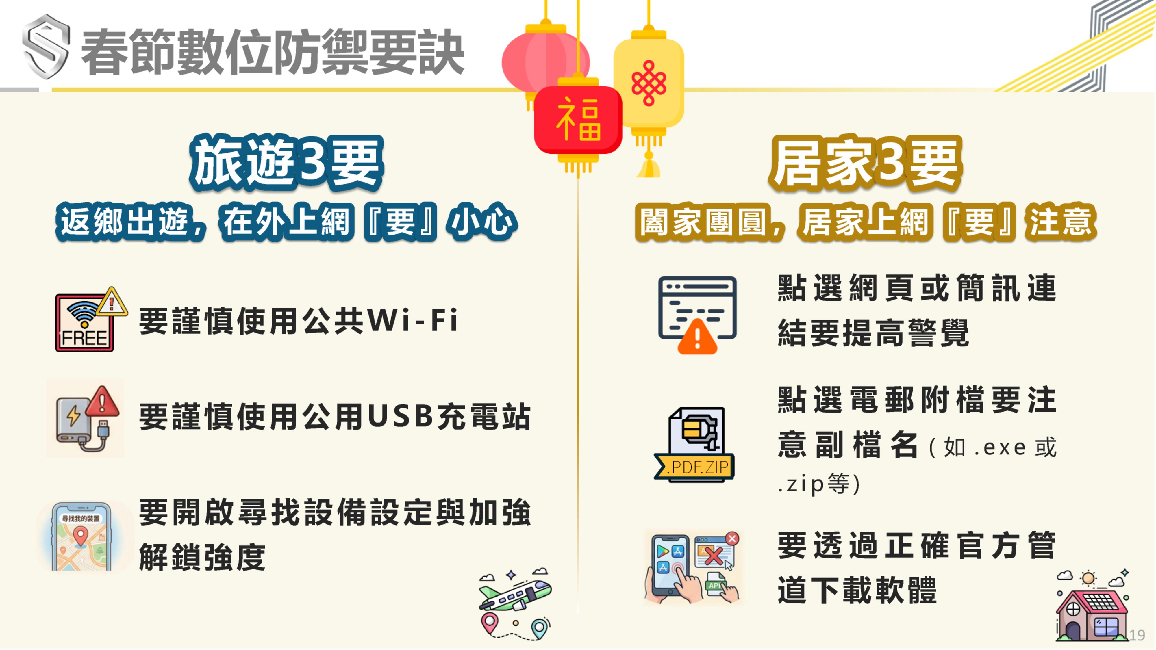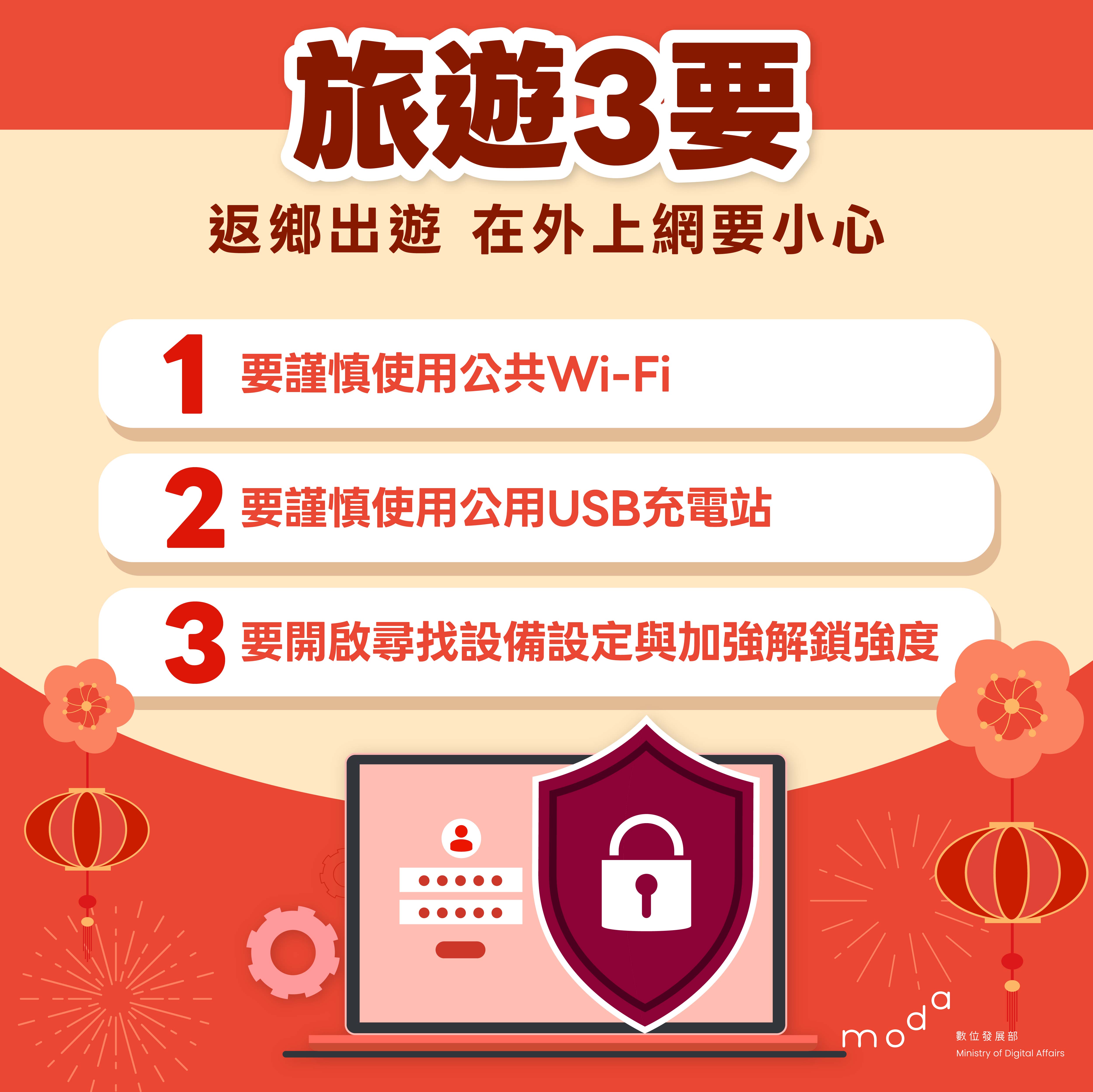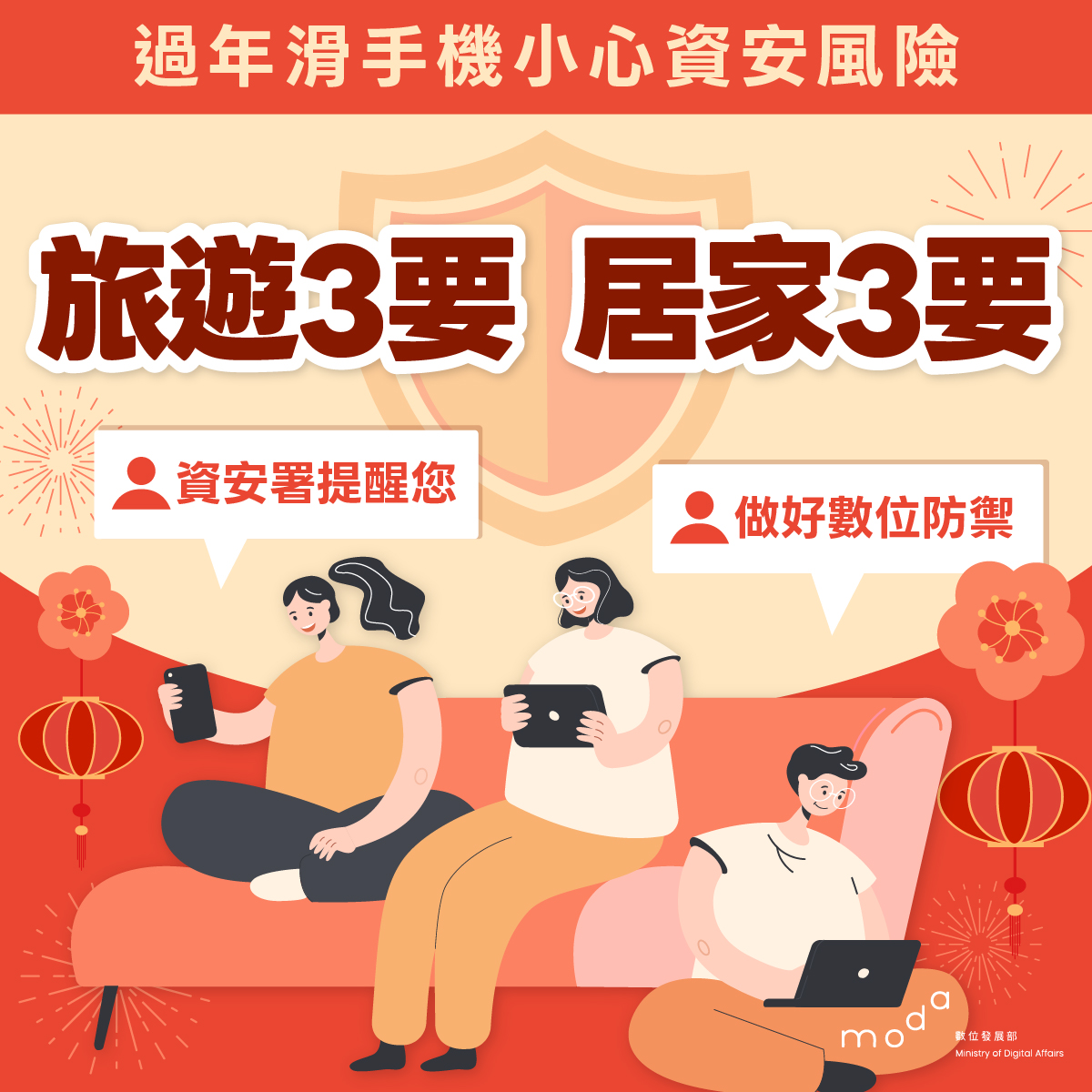 農曆春節將至,民眾常在春節連假期間出國旅遊或返鄉團圓,數位發展部資通安全署提醒民眾,資安威脅全年無休,民眾在享受數位便利之餘,仍應強化個人資安風險意識,呼籲民眾做好「旅遊3要、居家3要」數位防護守則,強化個人數位防禦,安心過好年。