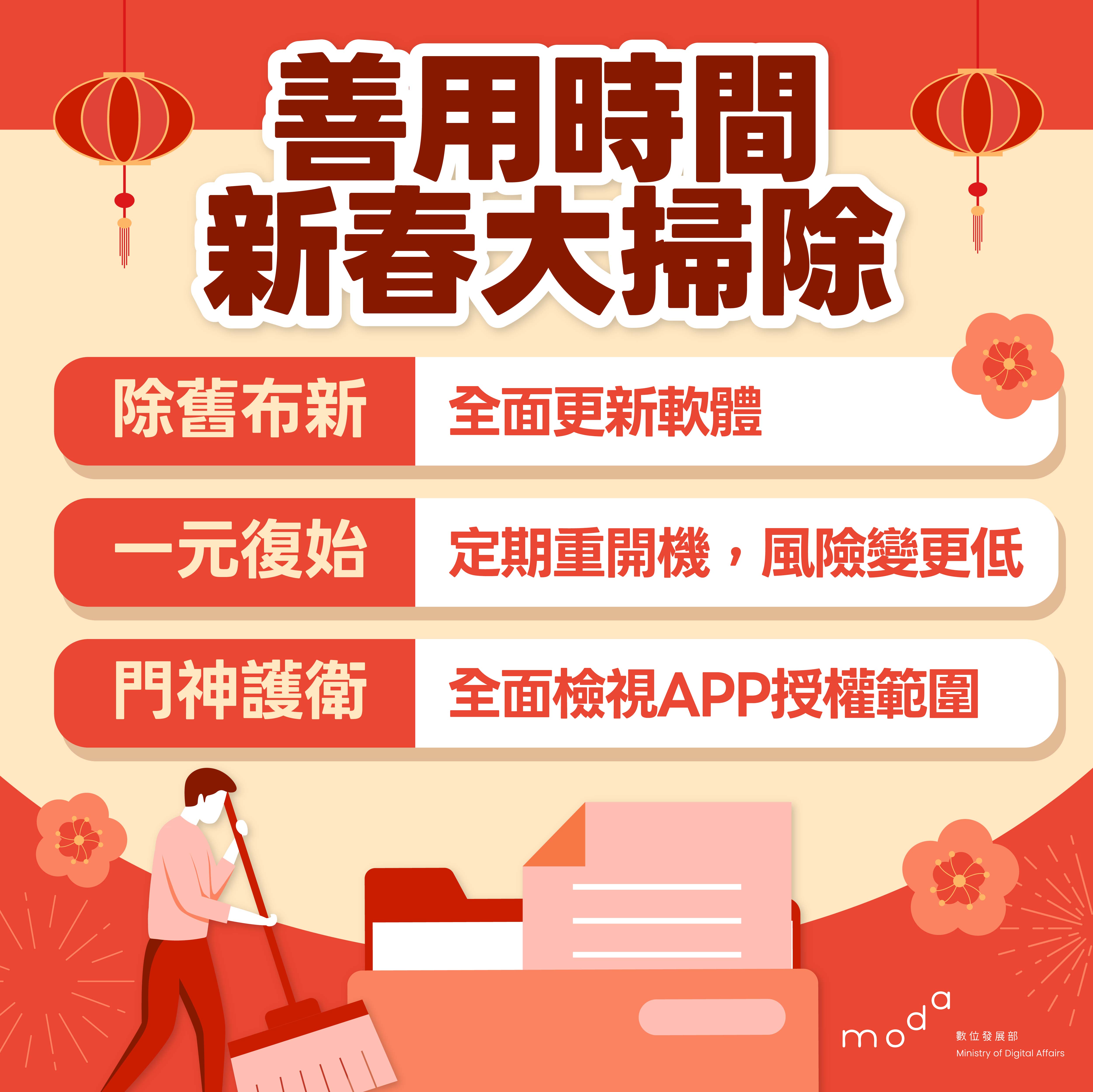 資安署表示,配合國人過年前大掃除習俗,也鼓勵民眾進行「數位大掃除」。除了全面更新作業系統與App修補安全漏洞、檢視App授權範圍以降低個人隱私風險外,也建議民眾養成手機定期重開機的習慣。