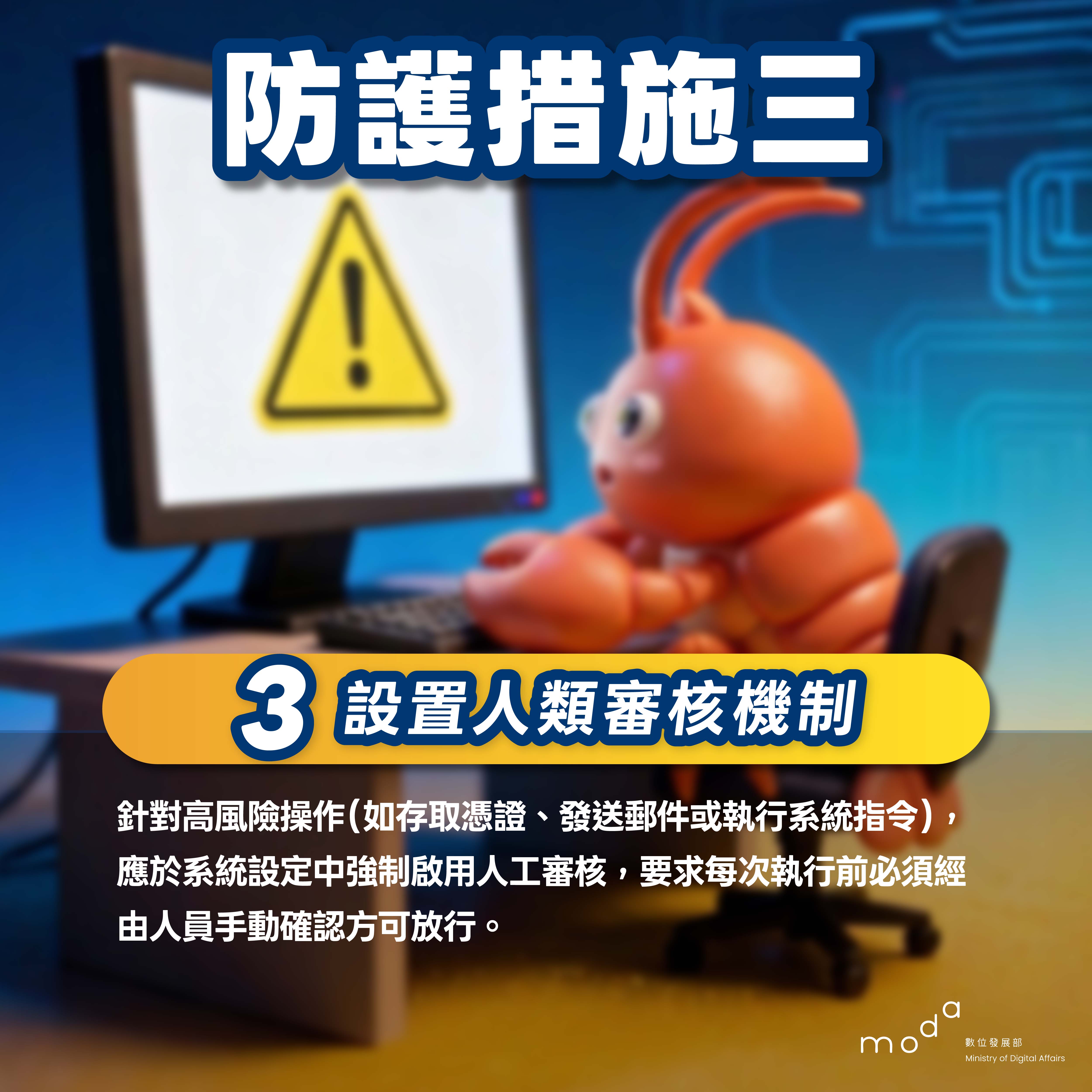 3.設置人類審核機制: 針對高風險操作(如存取憑證、發送郵件或執行系統指令),應於系統設定中強制啟用人工審核,要求每次執行前必須經由人員手動確認方可放行。