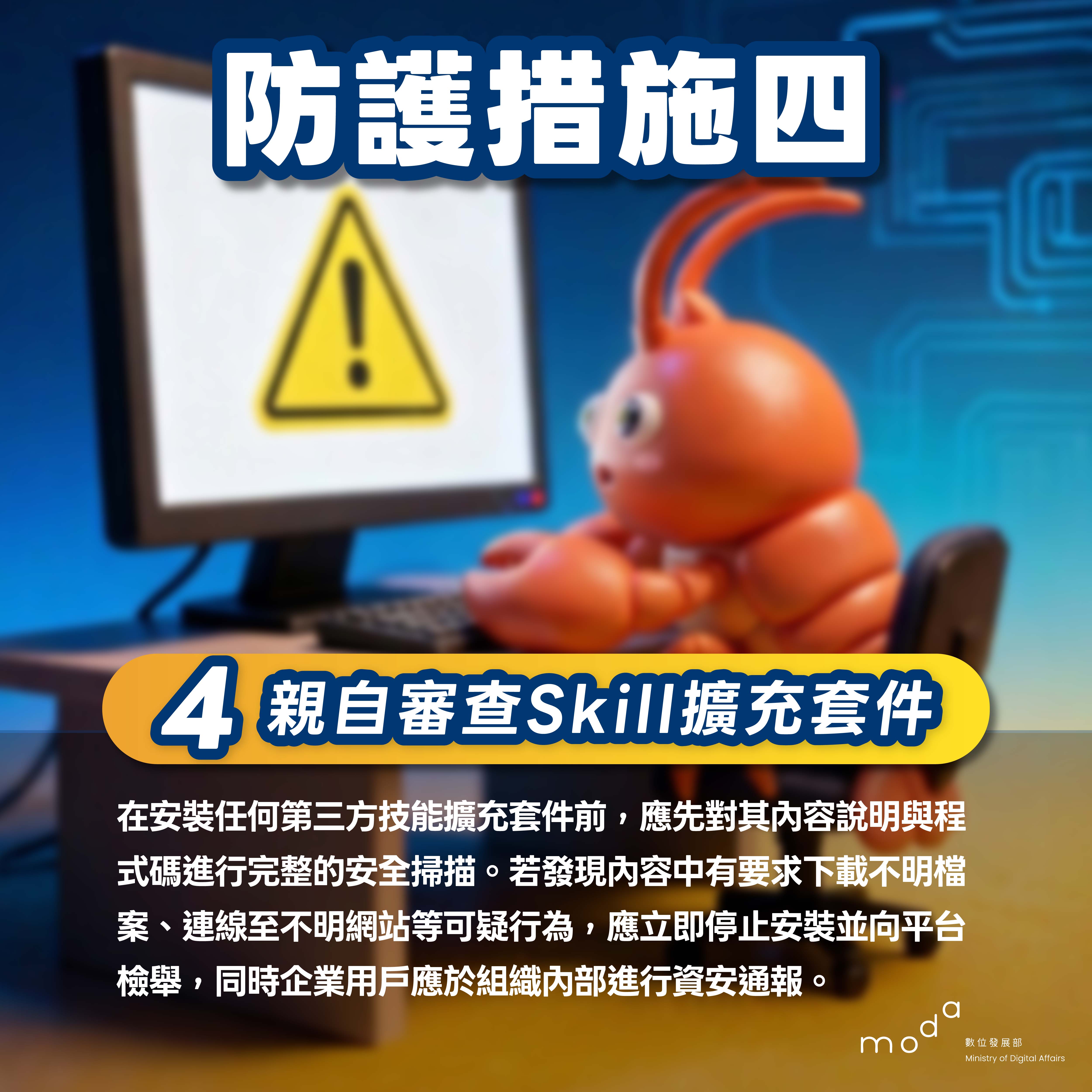 4.親自審查Skill擴充套件: 在安裝任何第三方技能擴充套件前,應先對其內容說明與程式碼進行完整的安全掃描。若發現內容中有要求下載不明檔案、連線至不明網站等可疑行為,應立即停止安裝並向平台檢舉,同時企業用戶應於組織內部進行資安通報。