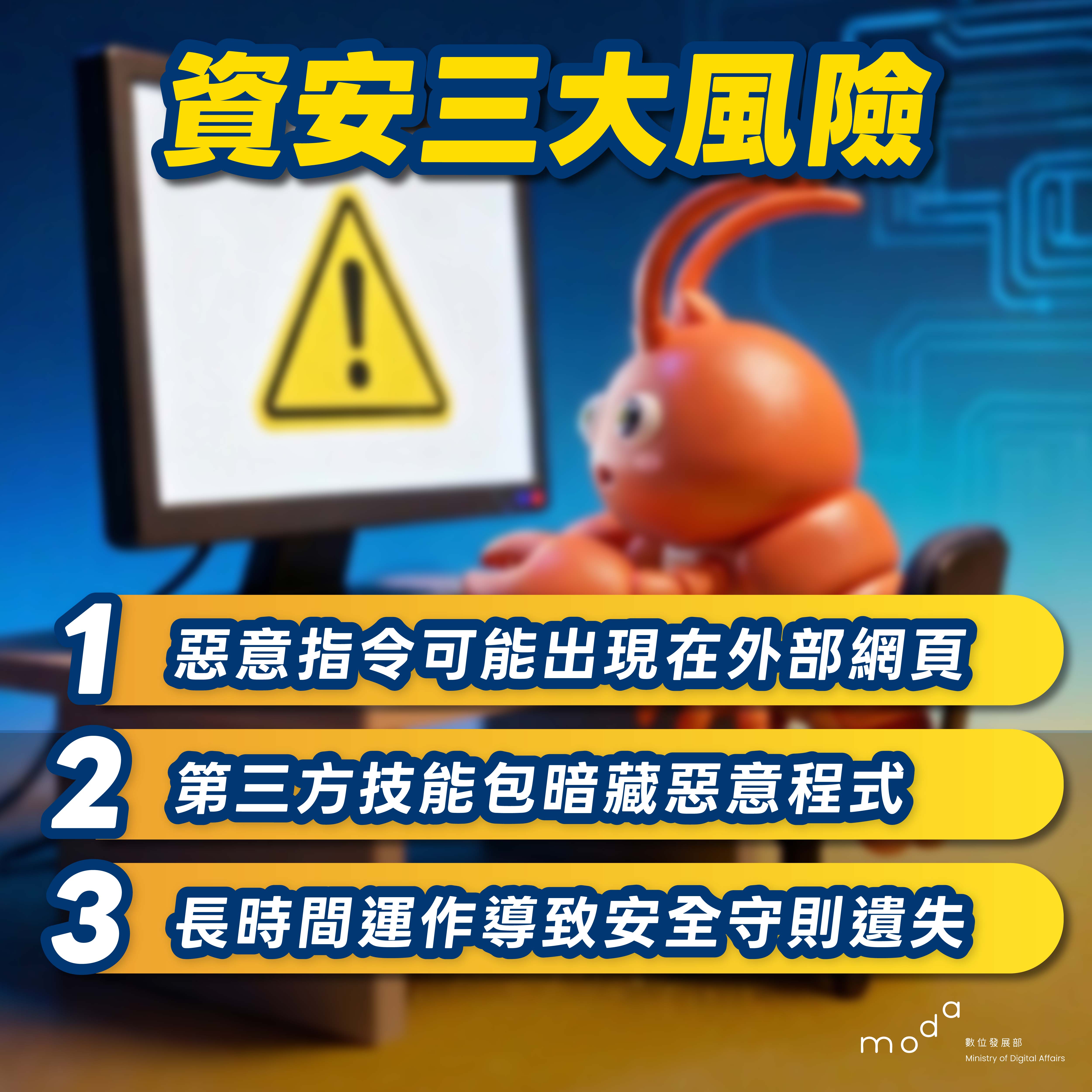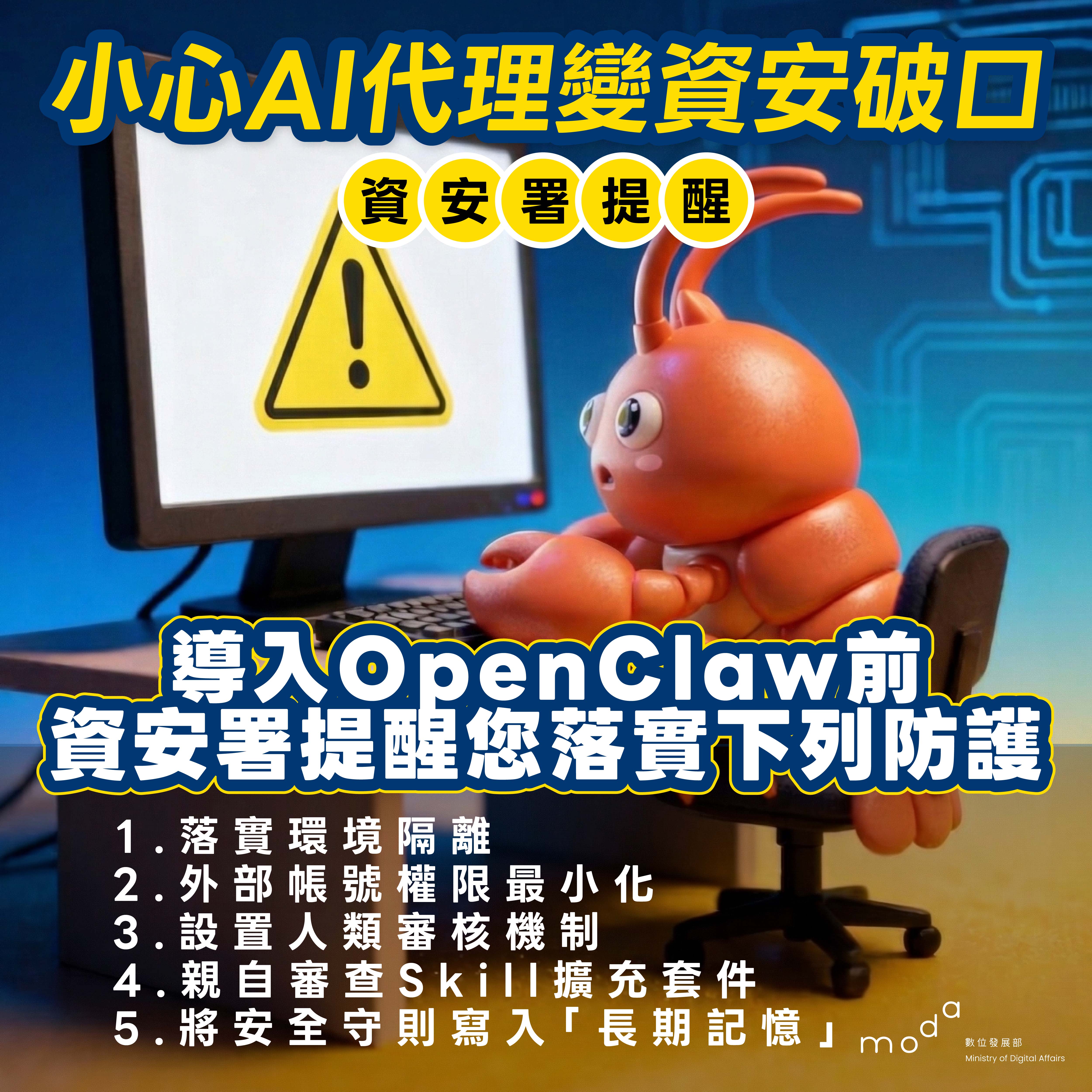 具備自主執行能力的 AI 代理工具(AI Agent,如近期廣受關注的開源專案 OpenClaw,俗稱龍蝦)已被廣泛應用於日常自動化任務。數位發展部資安署表示,此類工具在提升作業效率的同時,因具備極高的系統權限與24小時自主運作特性,若未妥善設定防護機制,極易成為駭客入侵個人主機與企業網路的破口,可能導致使用者個資、機敏資訊如帳號密碼及金融資料等外洩,引發身分冒用與財產損失風險。提醒使用者導入OpenClaw時,應落實資安防護與環境隔離。