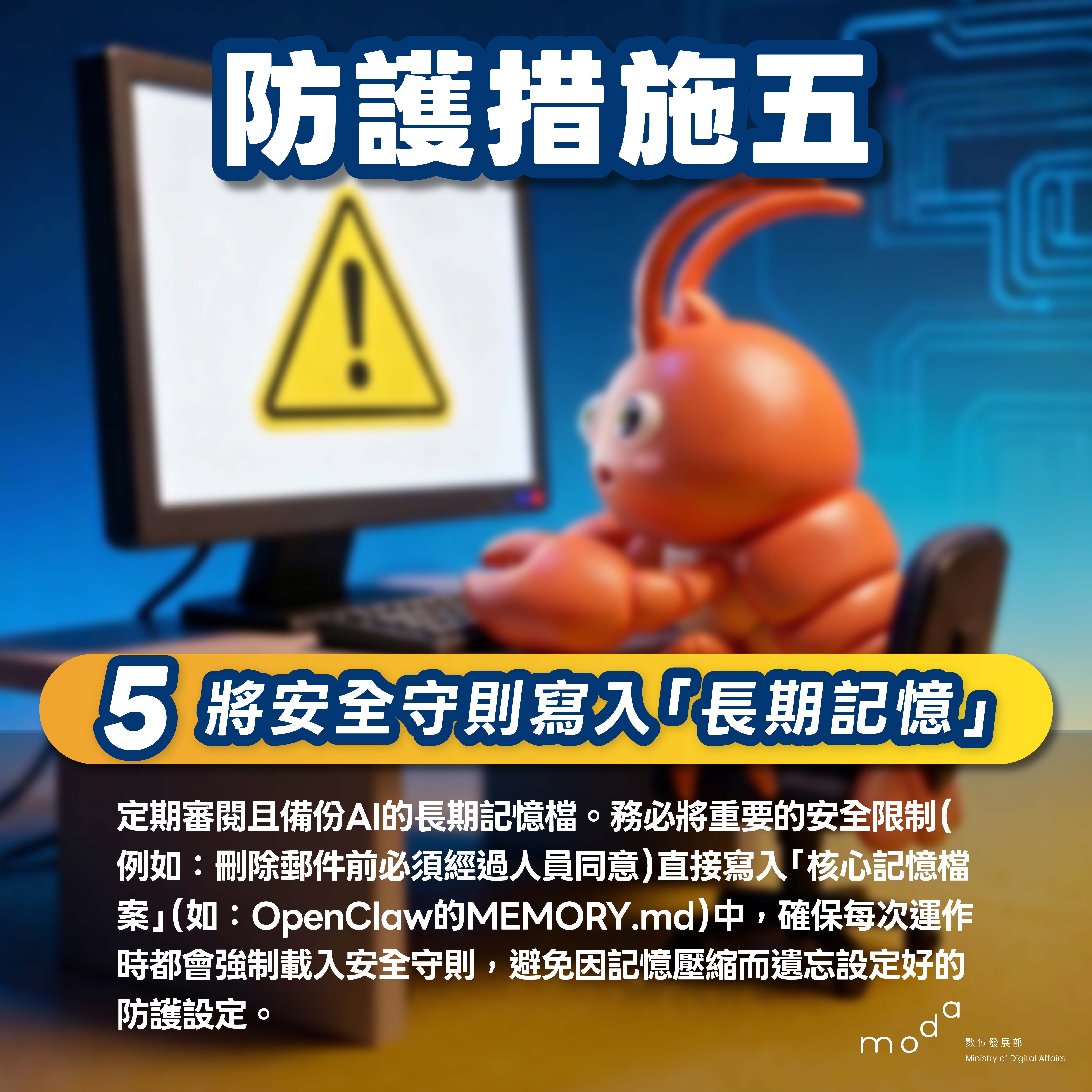 5.將安全守則寫入「長期記憶」: 定期審閱且備份AI的長期記憶檔。務必將重要的安全限制(例如:刪除郵件前必須經過人員同意)直接寫入「核心記憶檔案」(如:OpenClaw的MEMORY.md)中,確保每次運作時都會強制載入安全守則,避免因記憶壓縮而遺忘設定好的防護設定。