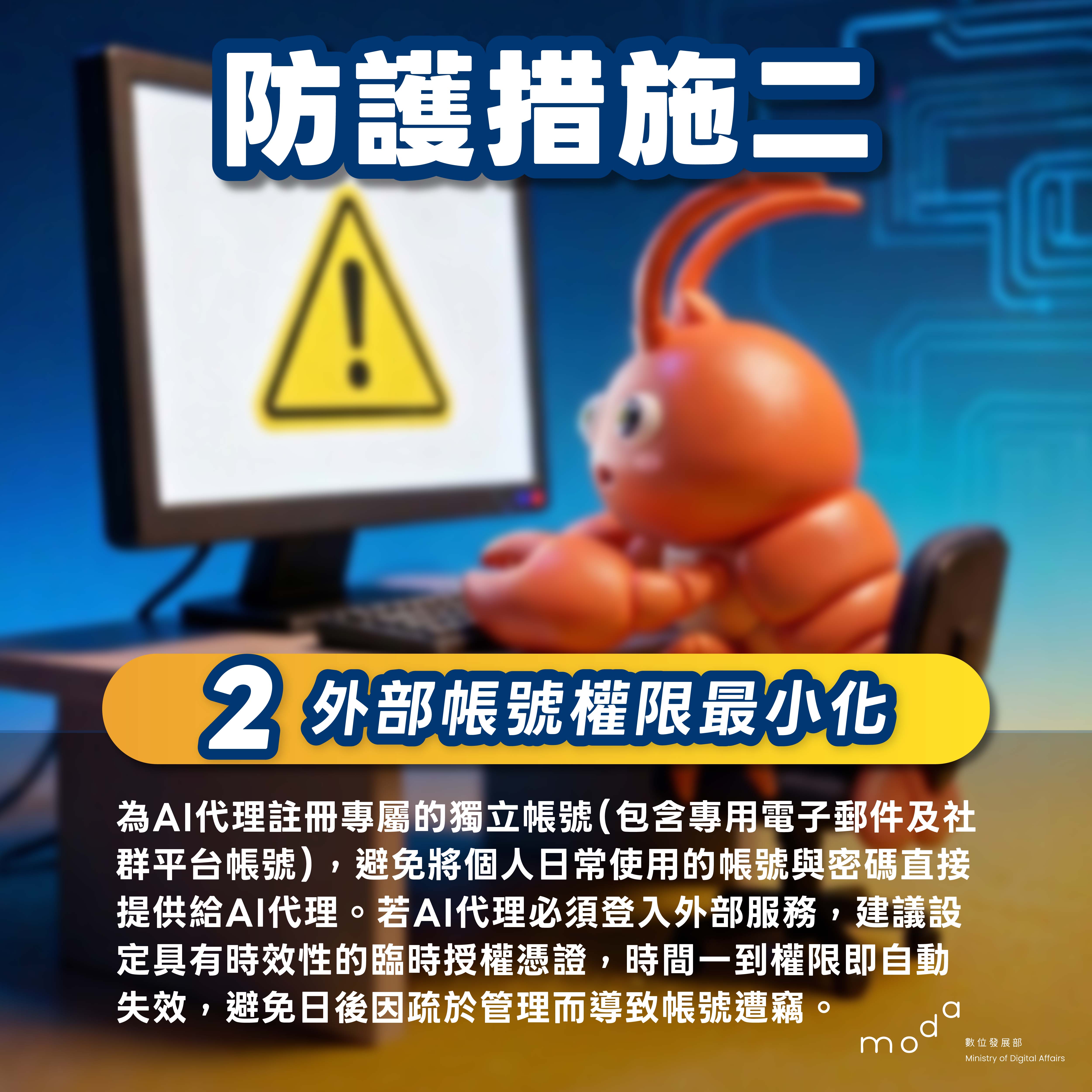 2.外部帳號權限最小化: 為AI代理註冊專屬的獨立帳號(包含專用電子郵件及社群平台帳號),避免將個人日常使用的帳號與密碼直接提供給AI代理。若AI代理必須登入外部服務,建議設定具有時效性的臨時授權憑證,時間一到權限即自動失效,避免日後因疏於管理而導致帳號遭竊。