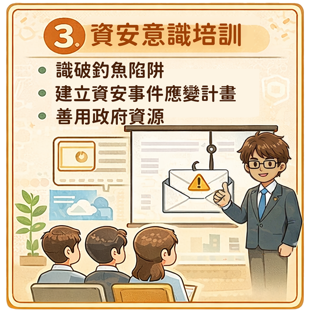 - 善用政府資源:免費註冊「台灣電腦網路危機處理暨協調中心 (TWCERT/CC)」會員,可接收最新威脅警報,獲取即時的資安情資 。另外,也可透過指引中附件的「中小企業資安參考資料資源」,從中小企業網路大學校、國家資通安全研究院及TWCERT/CC等,獲取免費的資安防護資源。