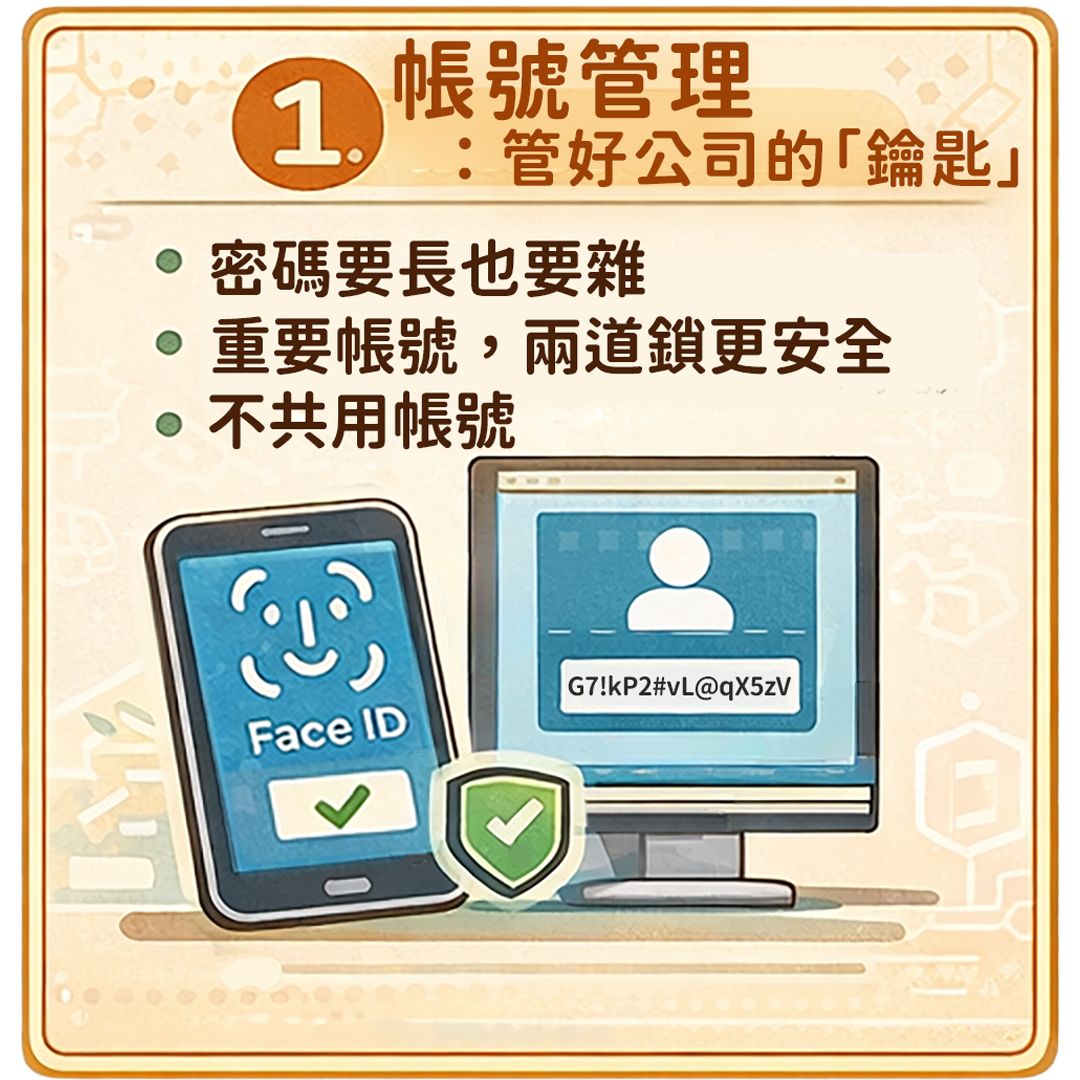 資安署指出,一組重複使用的密碼、一台三年未曾更新的桌機,看似日常,卻可能讓一間企業整週無法接單出貨。駭客偏好攻擊防護較薄弱的對象,因此沒有專職資安人力的中小企業,很容易成為阻力最小的入口。 資安防護不一定要花大錢買設備,關鍵在於應建立正確的作業流程與使用習慣 ,建議中小企業落實「帳號管理」、「設備和資料管理」與「資安意識培訓」資安三大面向: