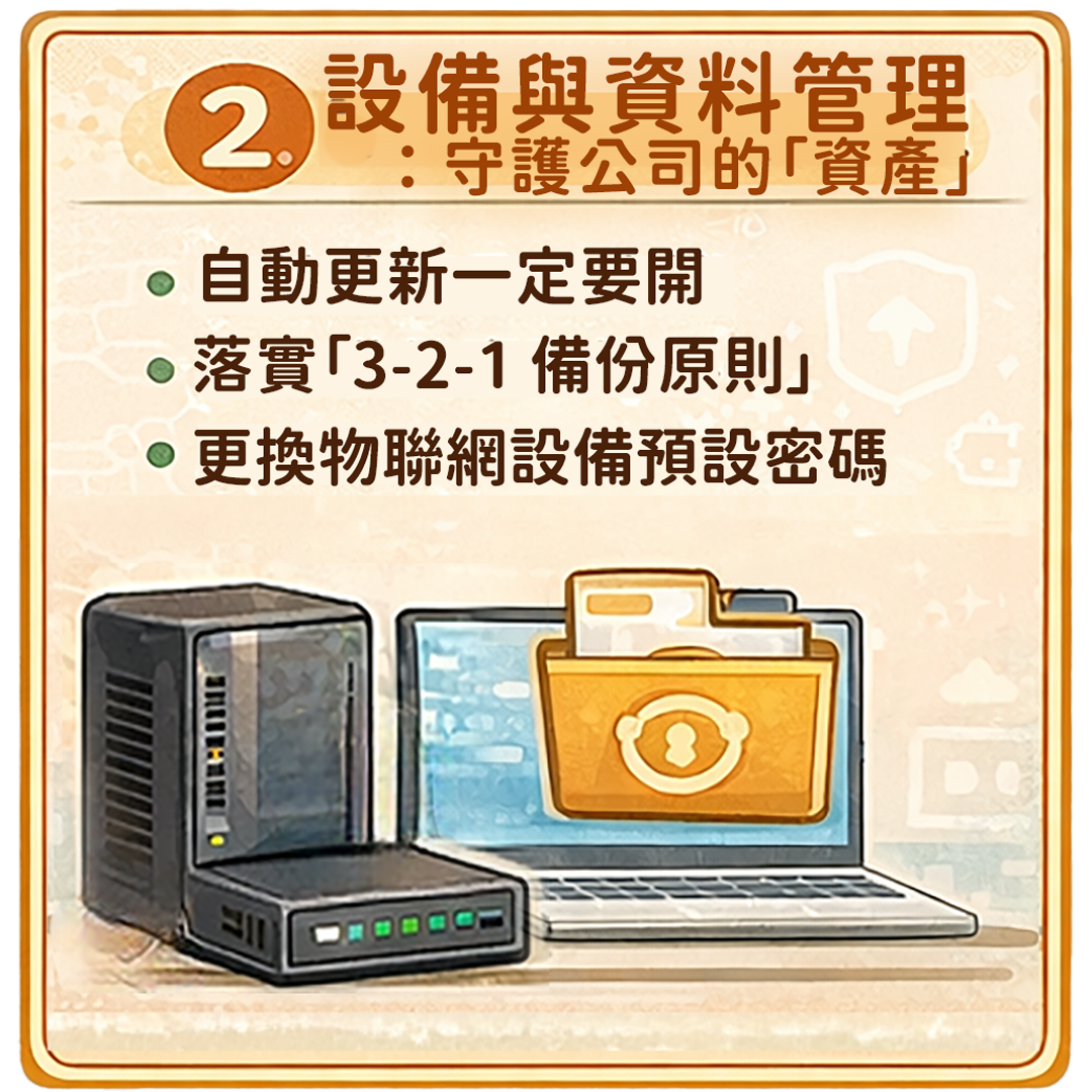 - 落實「3-2-1 備份原則」:公司資料至少要有3份備份、存放在2種不同儲存媒體、至少1份異地存放,並建議其中1份要離線存放(如外接硬碟),這是企業在遇到勒索軟體攻擊時,能把資料救回來的機會。