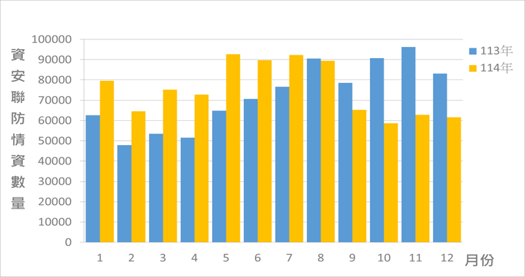 本月蒐整政府機關資安聯防情資共6萬1,580件(減少1,215件),分析可辨識的威脅種類,第1名為資訊蒐集類(45%),主要是透過掃描、探測及社交工程等攻擊手法取得資訊;其次為入侵嘗試類(21%),主要係嘗試入侵未經授權的主機;以及入侵攻擊類(18%),大多是系統遭未經授權存取或取得系統/使用者權限。統計近1年情資數量分布,詳見圖1