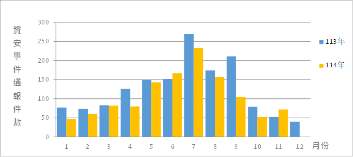 本月資安事件通報數量共107件,是去年同期的1.67倍,通報類型以非法入侵為主,占本月通報件數71.57%。本月份再次偵測到多個機關,因安裝冒牌軟體以致植入惡意程式占總通報件數32.71%。近1年資安事件通報統計詳見圖2。