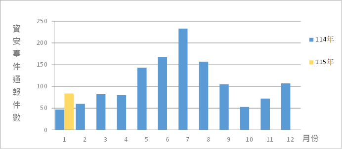 本月資安事件通報數量共84件,是去年同期的1.79倍,通報類型以非法入侵為主,占本月通報件數66.67%。本月份仍以接獲機關因安裝冒牌軟體以致植入惡意程式之通報最多,占總通報件數16.67%。近1年資安事件通報統計詳見圖2。