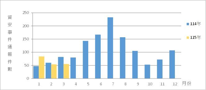 本月資安事件通報數量共55件,為去年同期的0.67倍,通報類型以非法入侵為主,占本月通報件數65.45%。本月持續發現多個機關因安裝冒牌軟體而遭植入惡意程式之情形。過往相關案例多以冒牌通訊軟體為主要手法,惟近期觀察攻擊者已逐步擴展至其他類型軟體,肇因為「使用/下載來源不明之應用程式/套件」的事件總數占總通報件數10.90%。近1年資安事件通報統計詳見圖2。