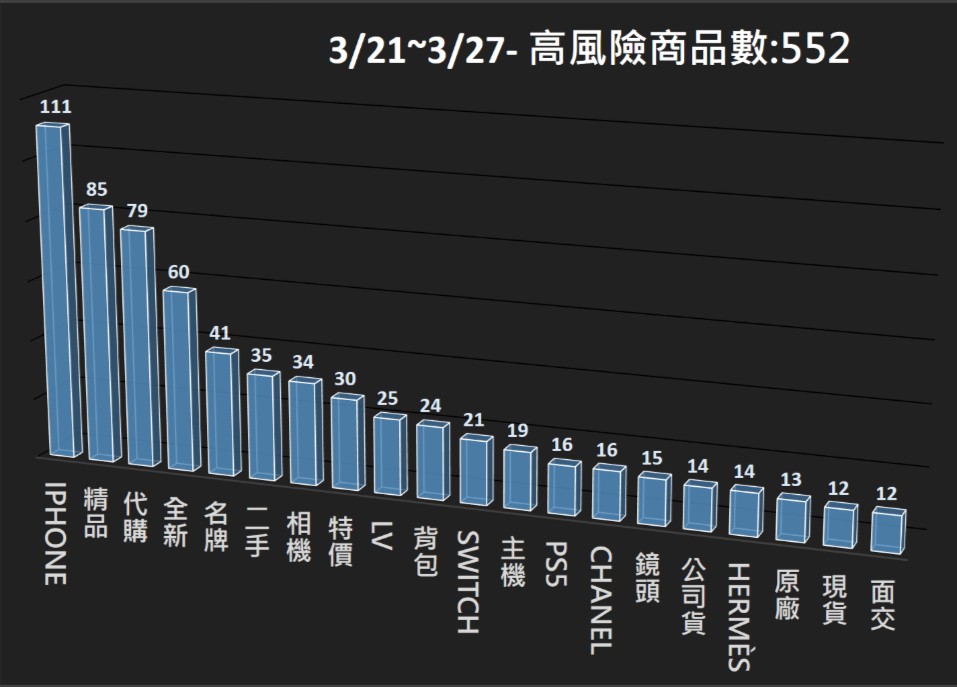 本署電商防詐雷達本週 (3/21~3/27),共掃瞄 24,021 筆電商平台商品,發現其中 552 筆為高風險商品,並已提供相關資訊給電商平台進行預防性下架,以降低消費者接觸詐騙商品的風險。