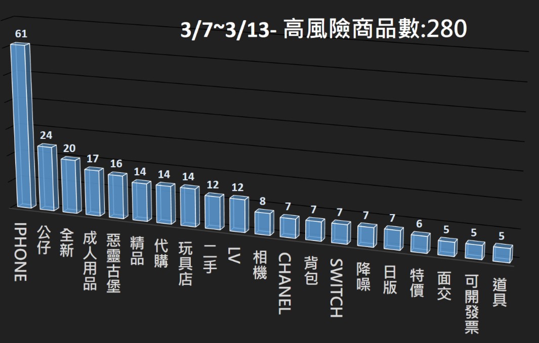 本署電商防詐雷達本週 (3/7~3/13),共掃瞄 26,007 筆電商平台商品,發現其中 280 筆為高風險商品,並已提供相關資訊給電商平台進行預防性下架,以降低消費者接觸詐騙商品的風險。