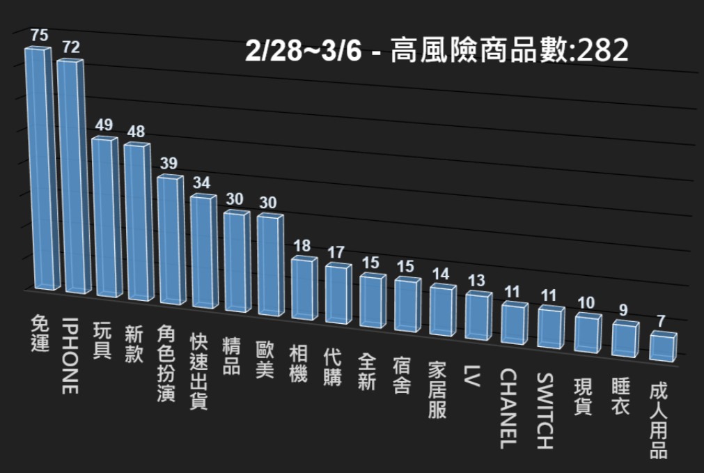 本署電商防詐雷達本週 (2/28~3/6),共掃瞄 24,682 筆電商平台商品,發現其中 282 筆為高風險商品,並已提供相關資訊給電商平台進行預防性下架,以降低消費者接觸詐騙商品的風險。