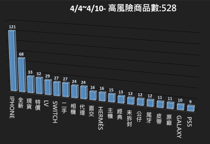 本署電商防詐雷達本週(4/4~4/10),共掃瞄 36,666 筆電商平台商品,發現其中 528 筆為高風險商品,並已提供相關資訊給電商平台進行預防性下架,以降低消費者接觸詐騙商品的風險。