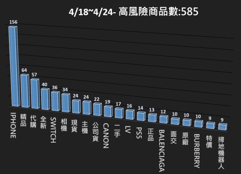 本署電商防詐雷達本週 (4/18~4/24),共掃瞄 37,624 筆電商平台商品,發現其中 585 筆為高風險商品,並已提供相關資訊給電商平台進行預防性下架,以降低消費者接觸詐騙商品的風險。