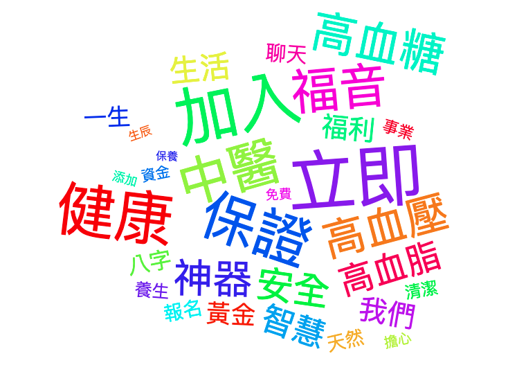 高頻的關鍵字包括:「致富」、「富豪」、「潛力」、「市場」、「佈局」、「逆襲」、「億萬」等,常見詐騙話術如:立即開始致富旅程、逆襲當富豪。