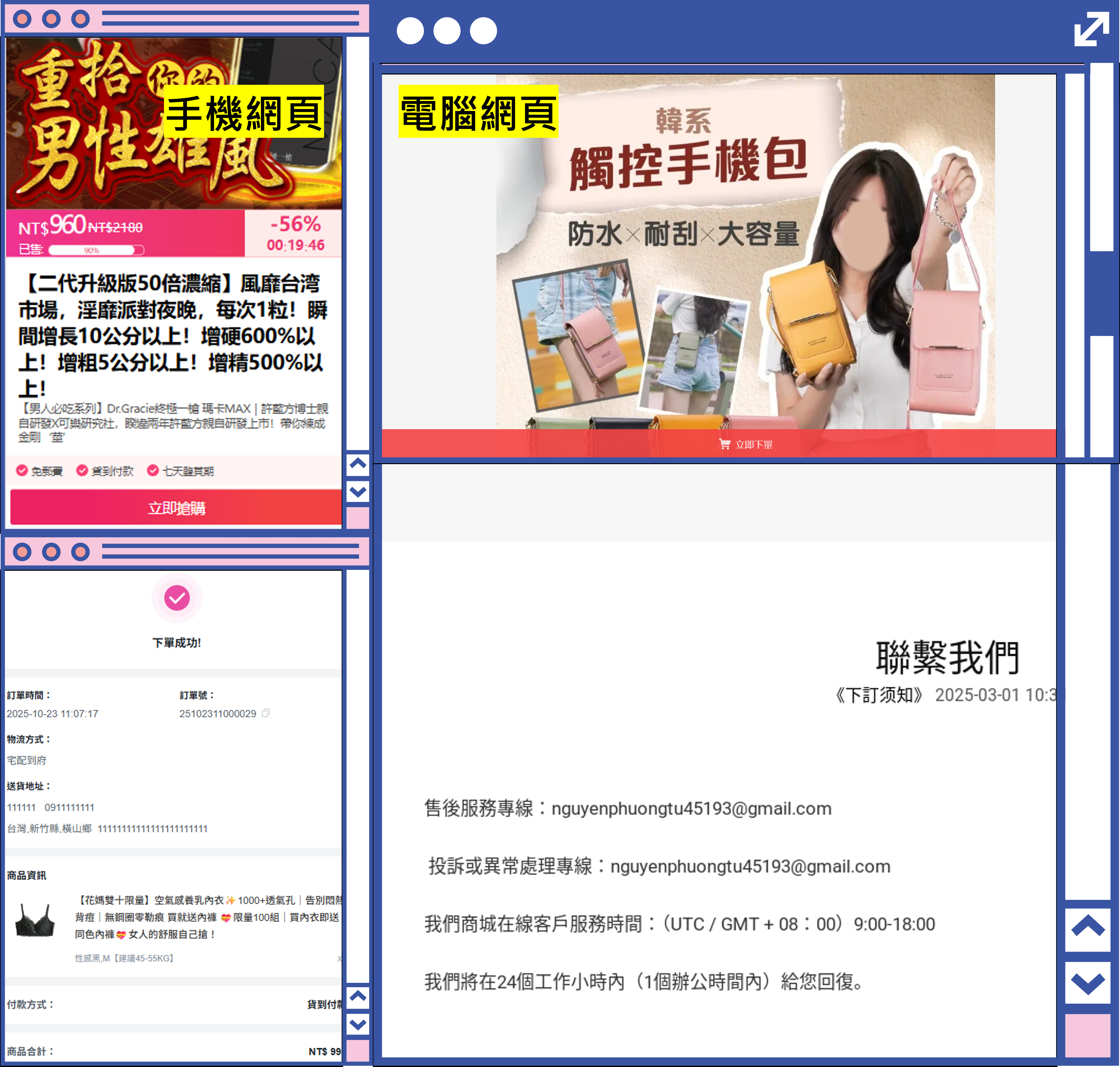 在 10 月 25 日至 10 月 31 日間,電商暨高風險網頁聯防通報平臺偵測到多個可疑網站,這些網站僅提供電子信箱或 LINE 客服、下單流程過於簡化且資訊亂填也能完成訂單,有些商品頁只能在手機開啟、電腦顯示不同內容,試圖騙取帳號與付款資訊。平臺已通報TWNIC協助阻攔阻擋,提醒民眾上網購物前務必確認網站可靠性,以保障個資與荷包安全。🦾🔏