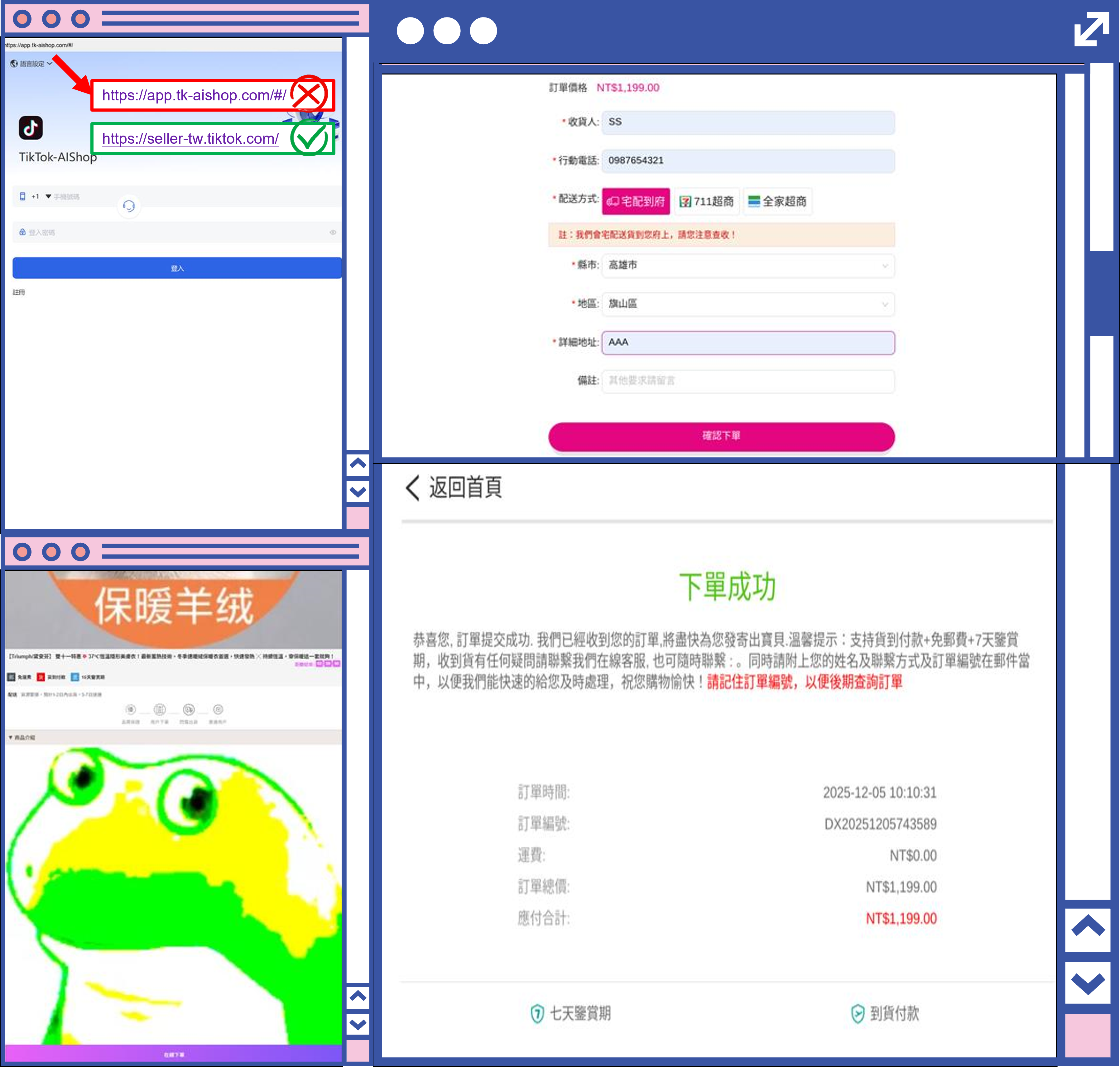 🧵無驗證的可疑下單流程:有些網站的下單流程過於簡單,甚至填寫錯誤資料也能完成訂單,缺乏任何驗證機制。這通常代表網站並非合法電商,而是利用簡單流程快速取得你的金流或個人資訊。遇到這種狀況,應立即停止操作並提高警覺。