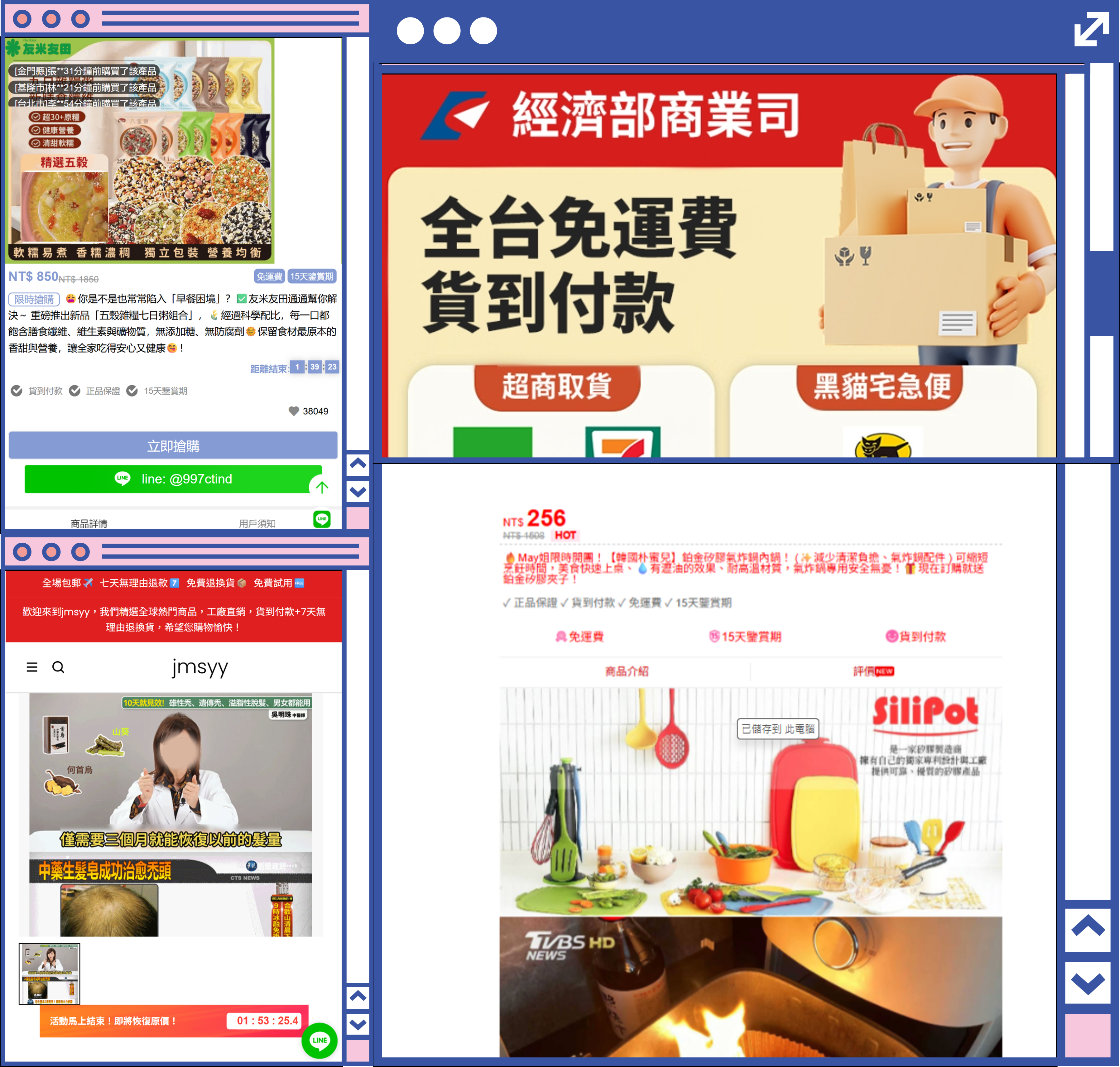 🧵混用簡體字與中國用語的假購物網:有些詐騙網站會混用簡體字、簡轉繁錯字或中國用語,讓消費者誤以為是跨境平台或官方授權通路。實際上,這是混淆視聽的手法之一,購物前可多檢查網站語言與客服資訊是否合理。