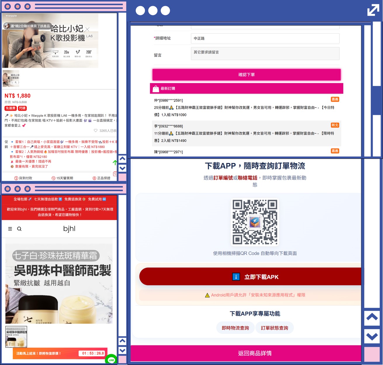 🧵假訂單動態製造搶購假象:不法分子透過虛構的訂單通知或假銷售數據,讓畫面不斷跳出「有人剛下單」或「只剩最後幾件」的提示,營造熱銷與時間壓力。這種心理操控讓人誤以為商品極受歡迎而急著下單,但實際上整個銷售流程可能都是造假,用來誤導消費者的精心設計。