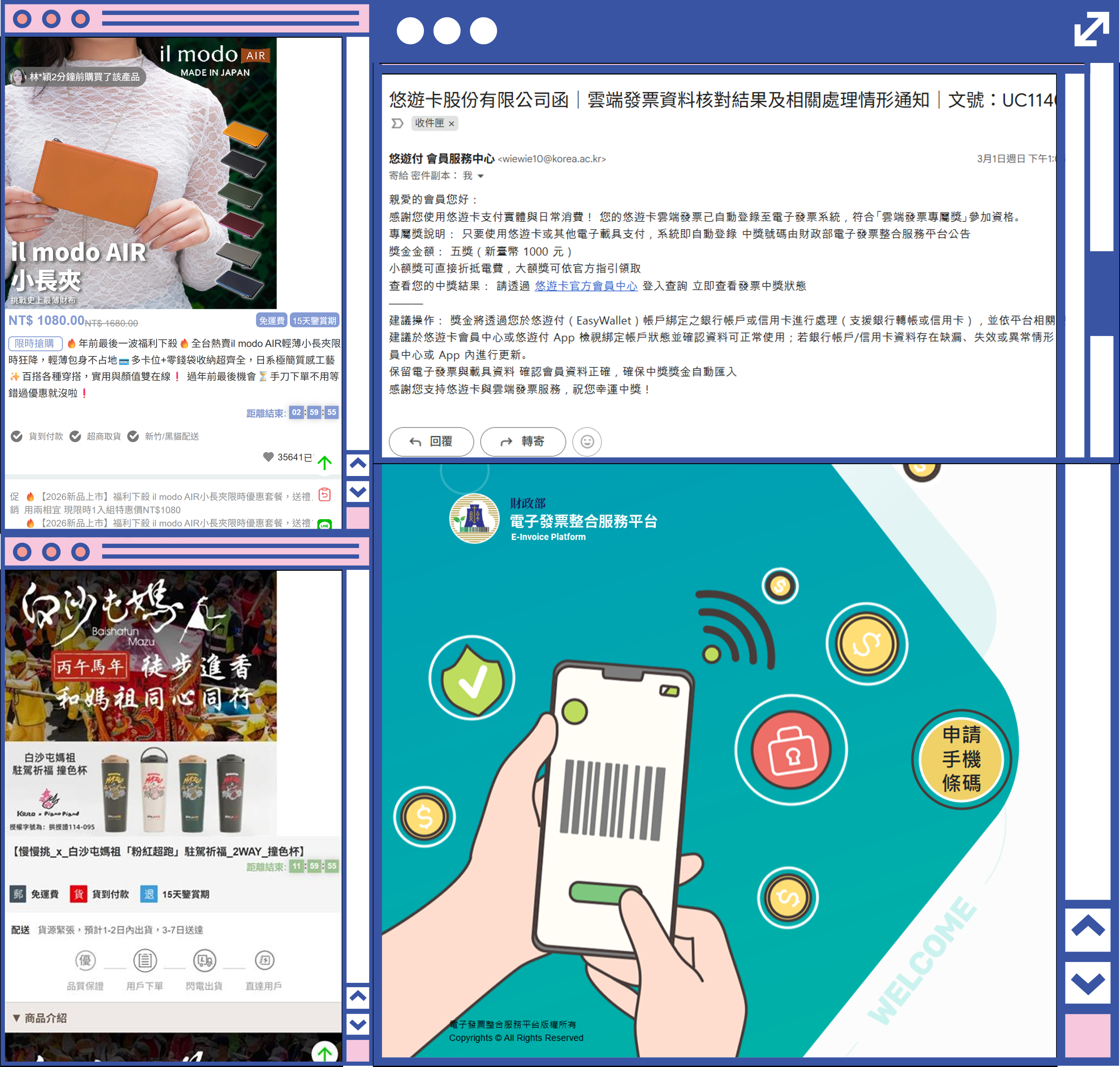 2 月 28 日至 3 月 6 日間,數位經濟高風險一頁式網頁聯防通報平臺查獲多起疑似詐騙購物網站,常見手法包括以電子發票通知為由誘導點擊連結,導向偽造驗證網站、以宗教信仰包裝商品降低警覺,以及透過造假倒數計時催促快速下單。平臺已通報TWNIC協助阻擋,並提醒大家網購前務必確認網站可信性,避免金錢與個資受損。🦾🔏