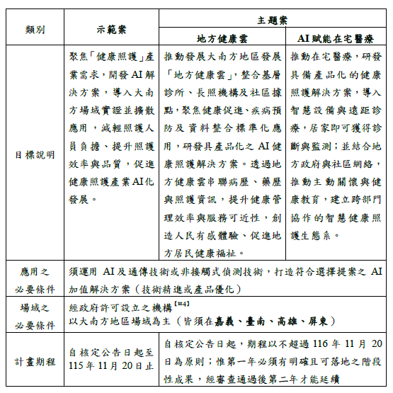 本計畫補助重點係協助資訊/電信服務業者、健康照護相關機構、大專校院等單位合作,配合大南方政策發展健康照護產業AI化,透過實證以導入符合產業需求的應用或服務。