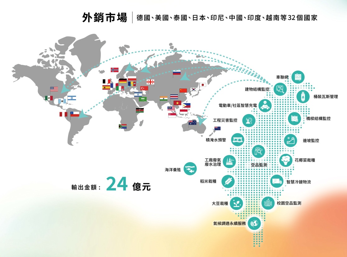 數位發展部數位產業署(數產署)推動「普及與深化民生公共物聯網資料應用計畫」,輔導業者運用跨部會(國科會、環境部、內政部、交通部、經濟部、農業部)水資源、空氣品質、地震與防救災等感測資料,開發創新物聯網解決方案與資料服務,並協助其參與國際展會及海外場域驗證,成功拓展國際市場。迄今已協助18家業者開發33項創新應用,涵蓋廢水廢氣治理、地震預警、建築安全、氣候調適及減災服務等領域,累積國際訂單逾新臺幣24億元,輸出至32個國家,展現臺灣在資料經濟與智慧應用的實力。