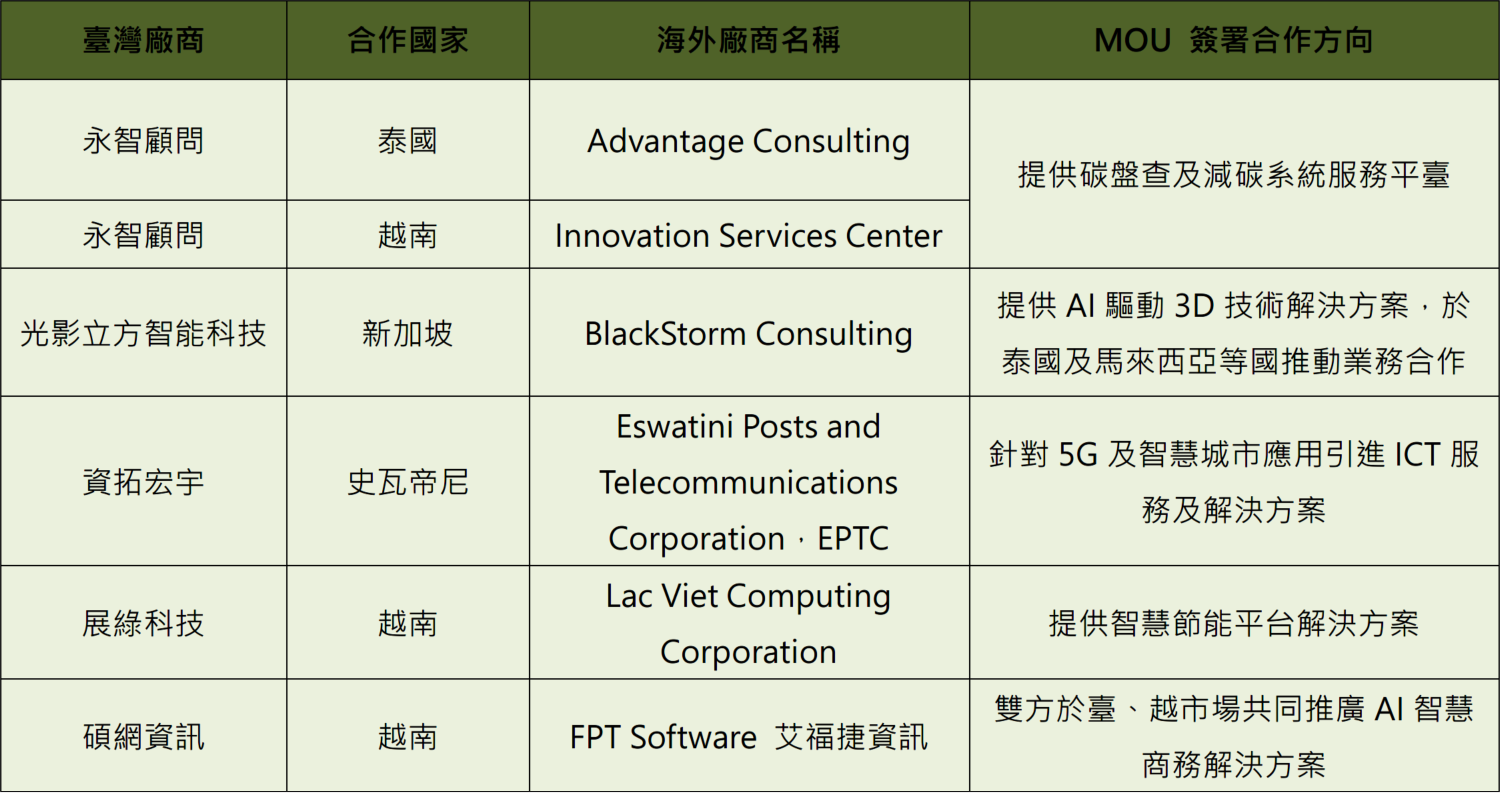 數位發展部長期以來協助臺灣業者拓展海外市場,持續串聯產業鏈上下游,組隊輸出臺灣智慧解決方案,並對接海外政府與產業夥伴,推動數位科技應用服務拓展國際市場。本次WSIC活動展現相關推動成果,現場舉行國際合作備忘錄簽署儀式,由胡貝蒂主秘見證臺灣企業永智顧問、光影立方智能科技、資拓宏宇、展綠科技及碩網資訊,與泰國、越南、新加坡及史瓦帝尼等國合作夥伴簽署共6項合作備忘錄。合作領域涵蓋碳盤查與減碳平台、AI 3D解決方案、5G智慧城市應用及智慧節能平台等,展現臺灣數位解決方案拓展海外市場的成果。