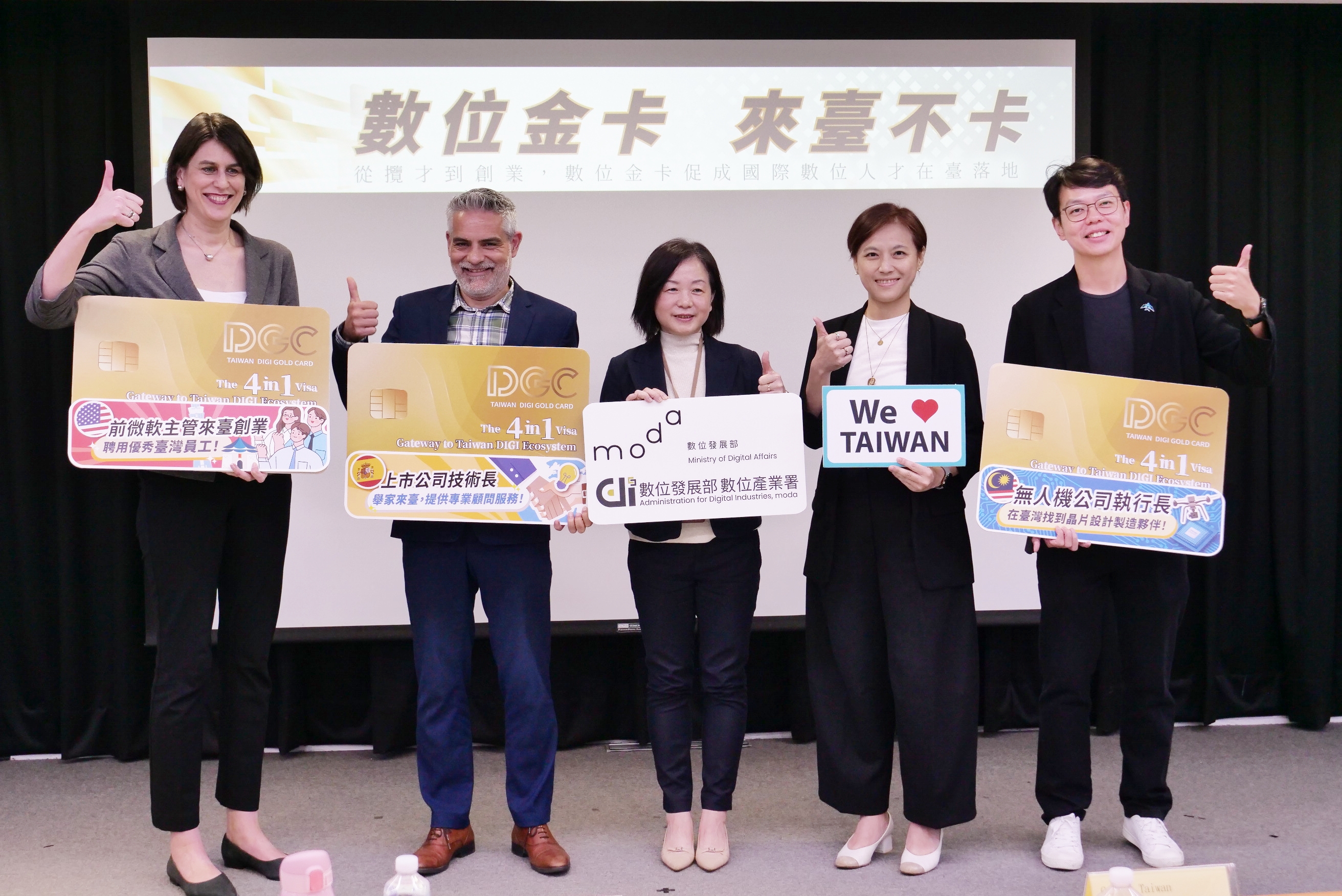 本次記者會邀請三位持有數位金卡的外國人才分享來臺發展經驗,包括來自馬來西亞的李軒先生(Shian Lee)、美國的畢凱俐小姐(Carrie Pederson),以及西班牙的谷杰祈先生(Jordi Vallejo)。李軒為無人機公司執行長,透過數位金卡制度能頻繁來臺洽商,並已與臺灣業者展開晶片設計與製造合作;畢凱俐看好臺灣開放的數位環境與透明法規,在臺創業並聘用臺籍員工;谷杰祈則與家人定居臺灣,並為多家臺灣數位公司提供專業顧問服務,協助企業拓展國際市場。