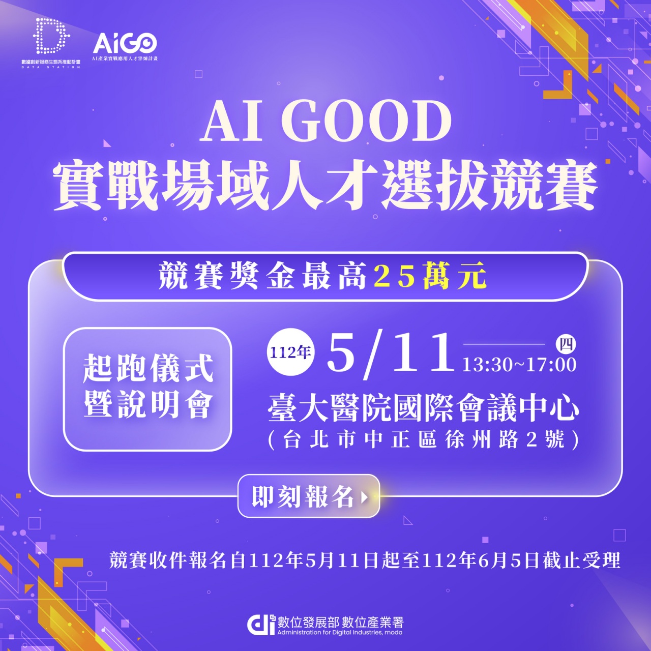 數位產業署為推動產業創新轉型,提升臺灣總體AI及數據人才質量,本(112)年度首度由「AI產業實戰應用人才淬煉計畫」與「數據創新服務生態系推動計畫」跨計畫合作辦理「AI GOOD實戰場域人才選拔競賽」(簡稱AI GOOD競賽),採以戰代訓模式提供AI實證場域試煉,於實戰中培訓AI及數據應用人才,強化產業數位人才即戰力,進而加速推進企業發展創新應用服務與產業 數位化轉型。