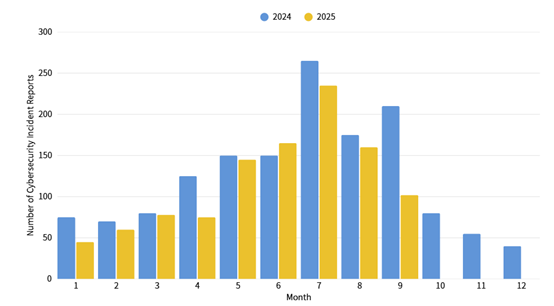 The number of cybersecurity incident reports totaled 106 this month, a 49.76% decrease compared to the same period last year. The reported incident type was primarily illegal intrusion. The National Institute of Cyber Security (NICS) discovered that some agency information equipment showed connection characteristics of the PUBLOAD malicious program. After investigation by the agencies, most of these were found to be caused by USB drive infection. Statistics for cybersecurity incident reports over the past year are as shown in Figure 2.