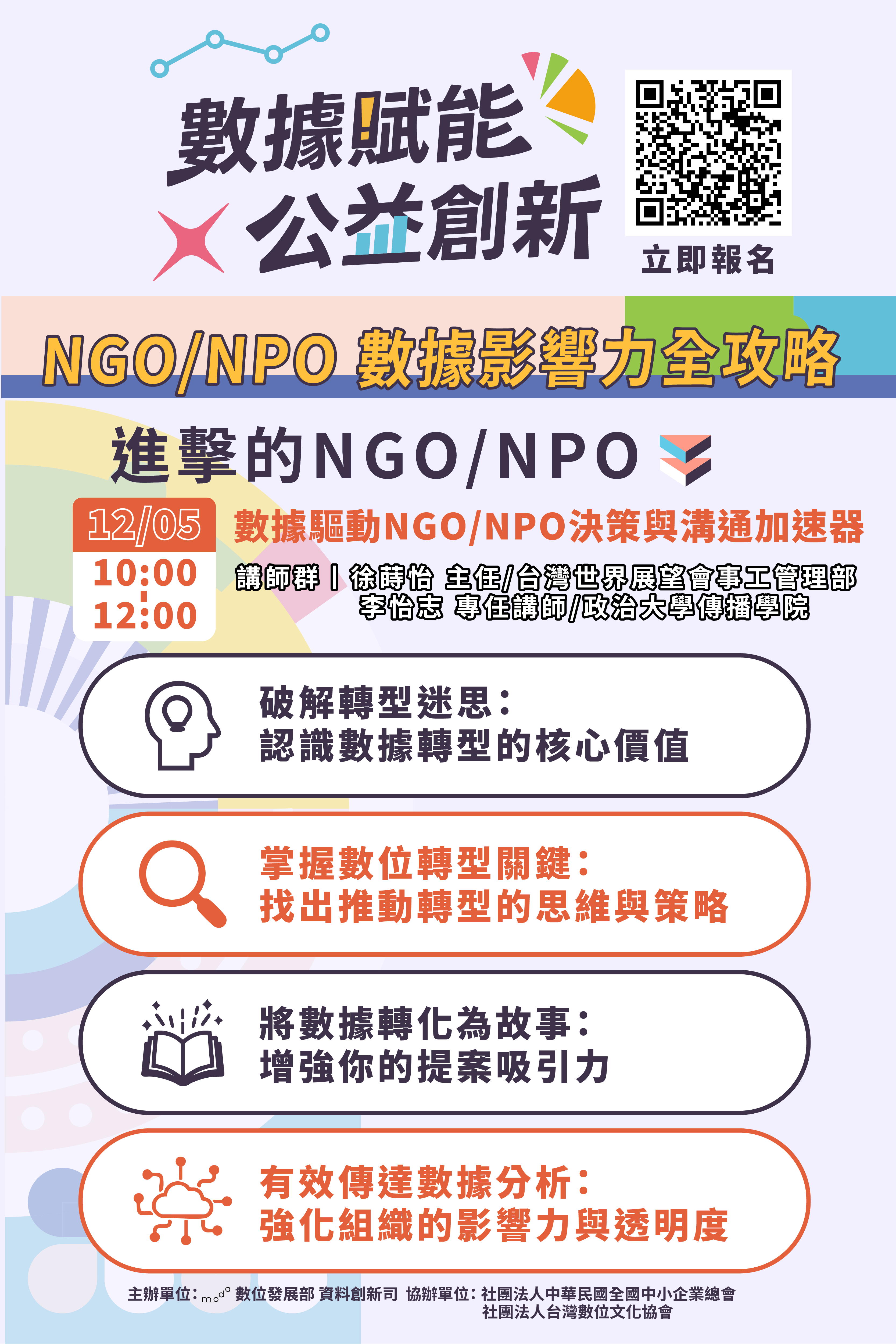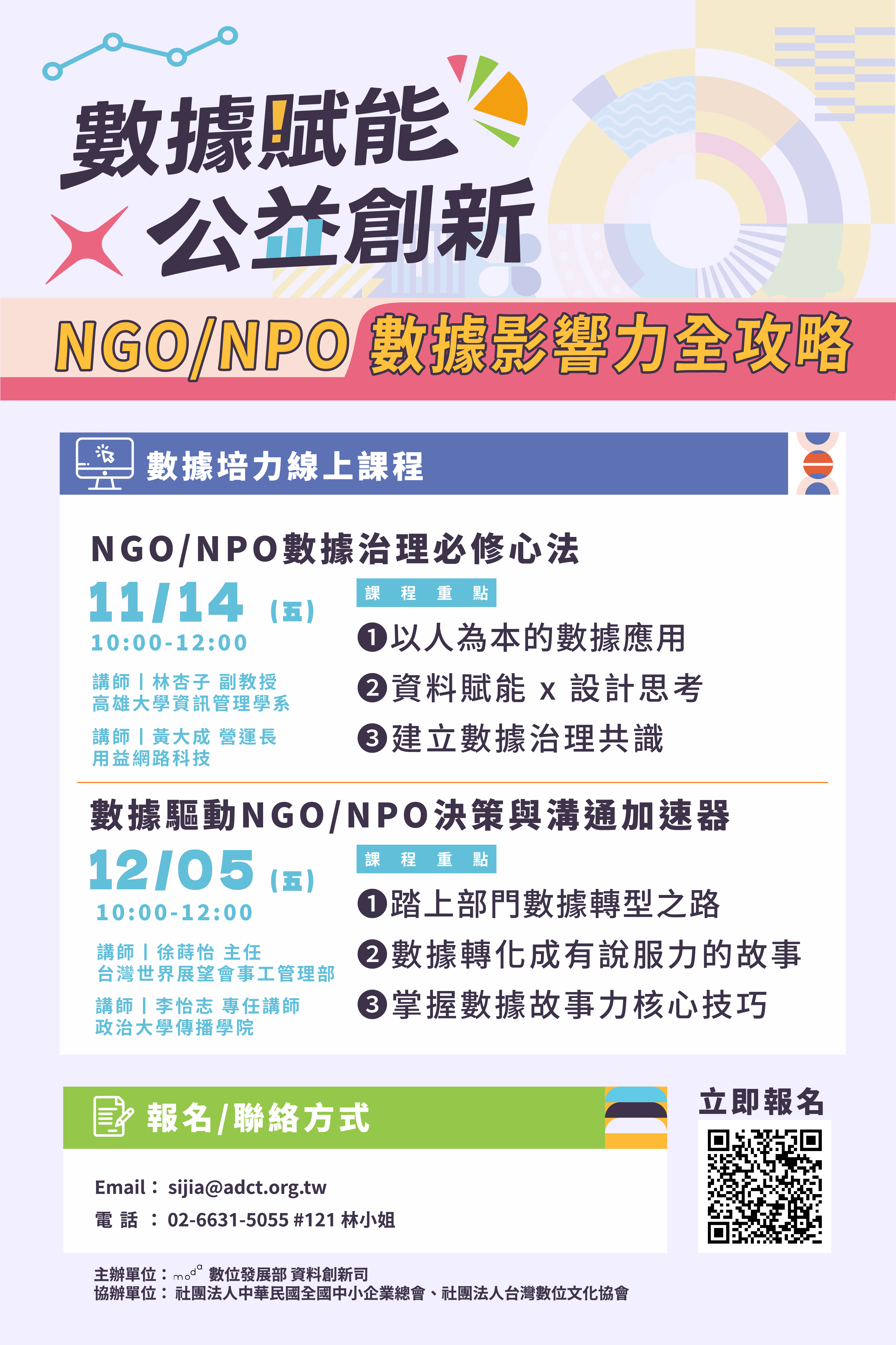 歡迎有興趣的NGO/NPO夥伴踴躍參加、廣為分享,一起讓組織的數據力 Level Up!