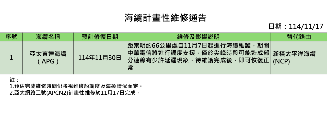 六、亞太直達海纜障礙及計畫性維修示意圖