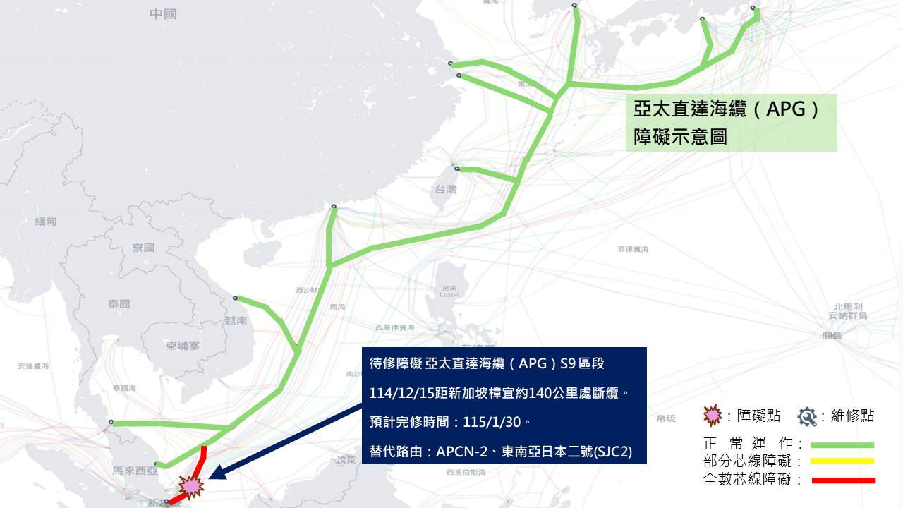 | 114/12/15 | 距新加坡樟宜約140公里處斷纜 | APCN-2、SJC2 | 115/1/30 | ||