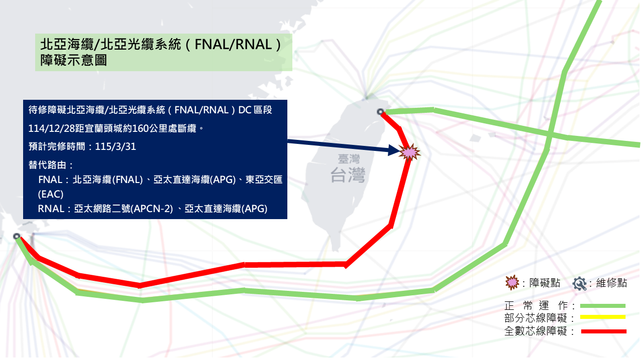 114/12/28 | 距宜蘭頭城約160公里處斷纜 | APCN-2、APG | 115/3/31 |
