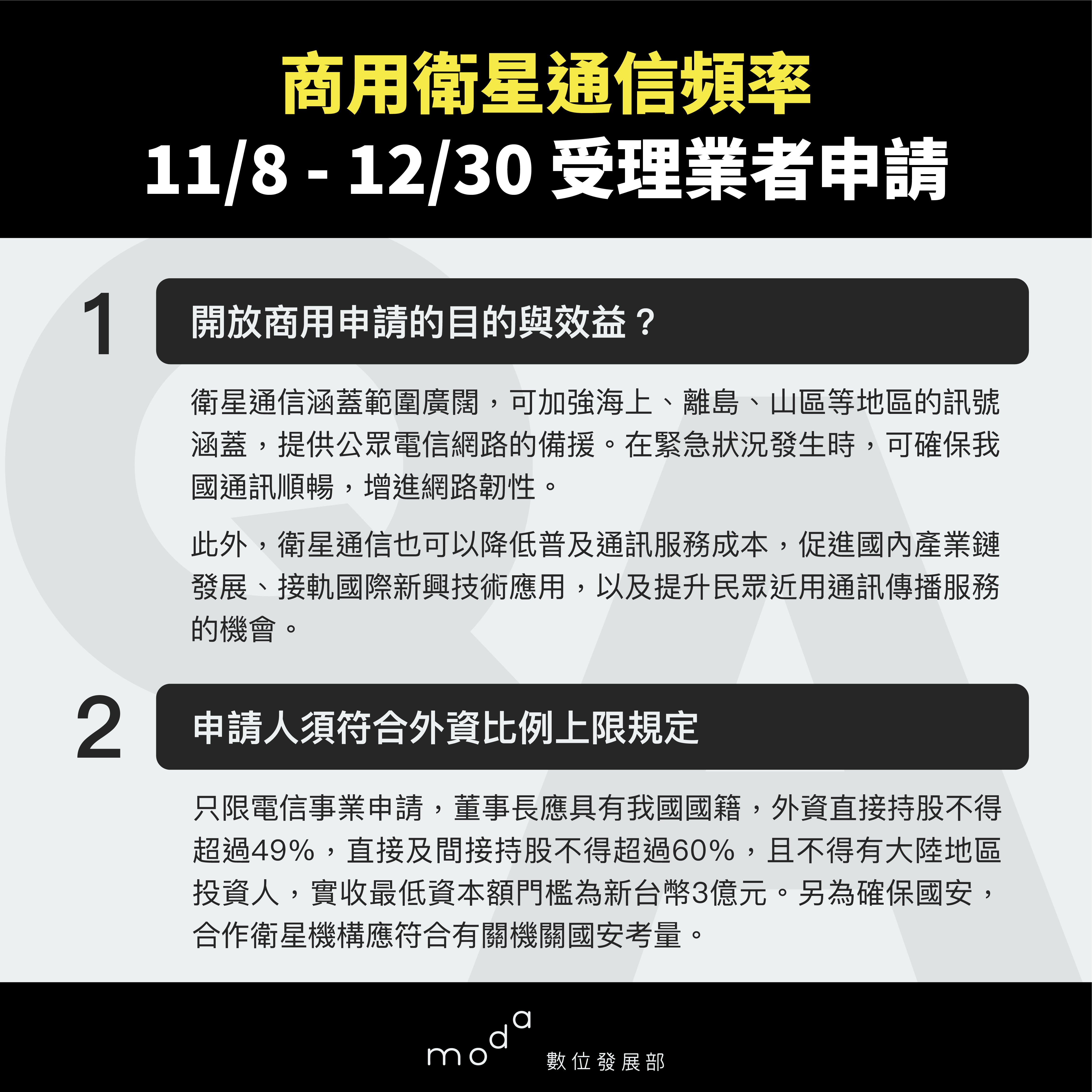 只限電信事業申請,董事長應具有我國國籍,外資直接持股不得超過49%,直接及間接持股不得超過60%,且不得有大陸地區投資人,實收最低資本額門檻為新台幣3億元。另為確保國安,合作衛星機構應符合有關機關國安考量。